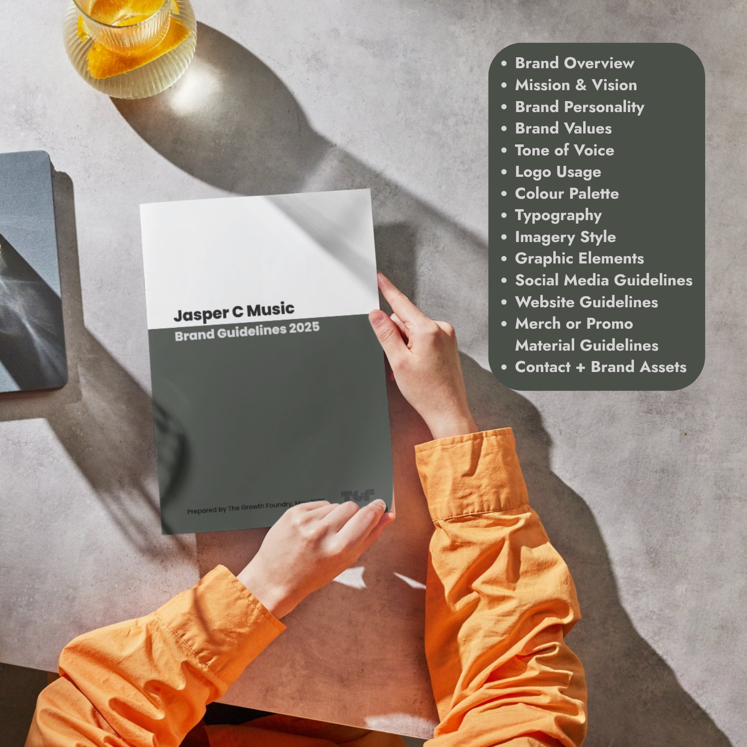 A full set of brand guidelines to help him stay consistent with visuals, messaging, and tone of voice (even when juggling gig bookings and social posts).